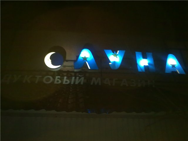 Задание #71 В общем вы не поверите... гуляя по нашему замечательному городу, полному удивительных вещей, наткнулся на магазин меняющий свое название в зависимости от времени суток. В светлое время он называется Продовольственный магазин Сауна.